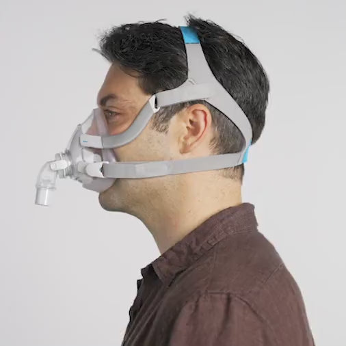 The ResMed AirFit F20 is a full-face CPAP mask designed with a proprietary InfinitySeal silicone cushion that adapts to movement and helps minimize leaks, even at higher pressures. The mask also features quiet venting, magnetic headgear clips for easy removal, and a quick-release elbow for added convenience.