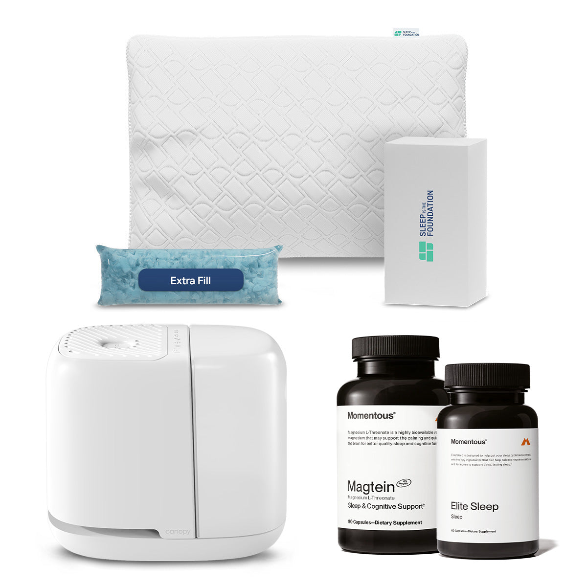 Designed for the Dolphin chronotype, the Dolphin Drift Bundle helps light sleepers relax and recharge. Momentous Elite Sleep and Momentous Magnesium L-Threonate Supplement capsules support relaxation and natural sleep cycles, the Canopy Bedside Humidifier 2.0 creates an ideal sleep environment, and the Adjustable Shredded Memory Foam Pillow offers customizable support for the perfect night's rest. Relax, drift off, and wake up feeling restored.
