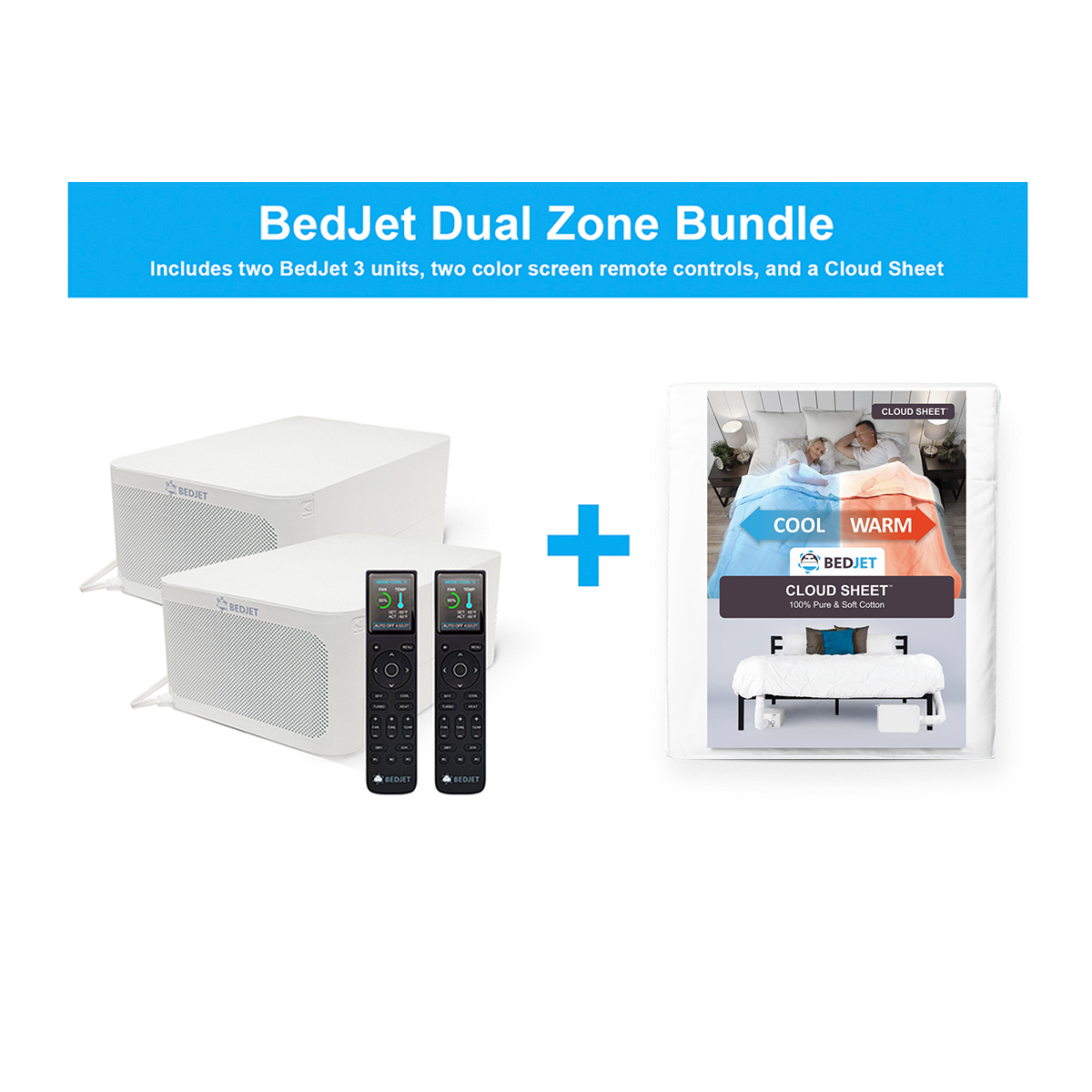 Dual Zone System for Couples includes 2 BedJet base units, 2 wireless LCD screen remotes and a Dual Zone Cloud Sheet.