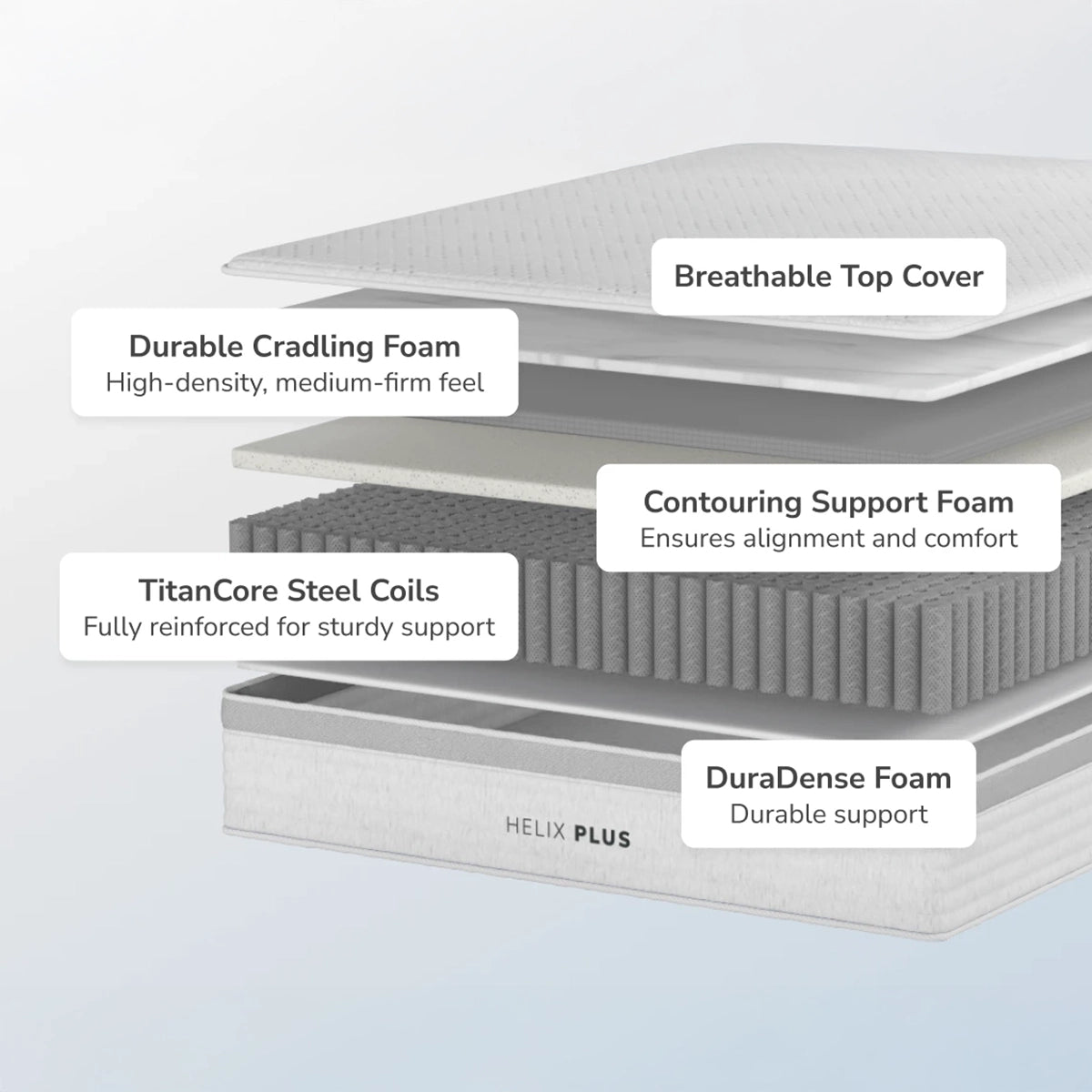 Helix Plus is a hybrid mattress specifically designed for heavier sleepers. It has a medium firm feel, with high-density foam and reinforced steel coils for extra support.