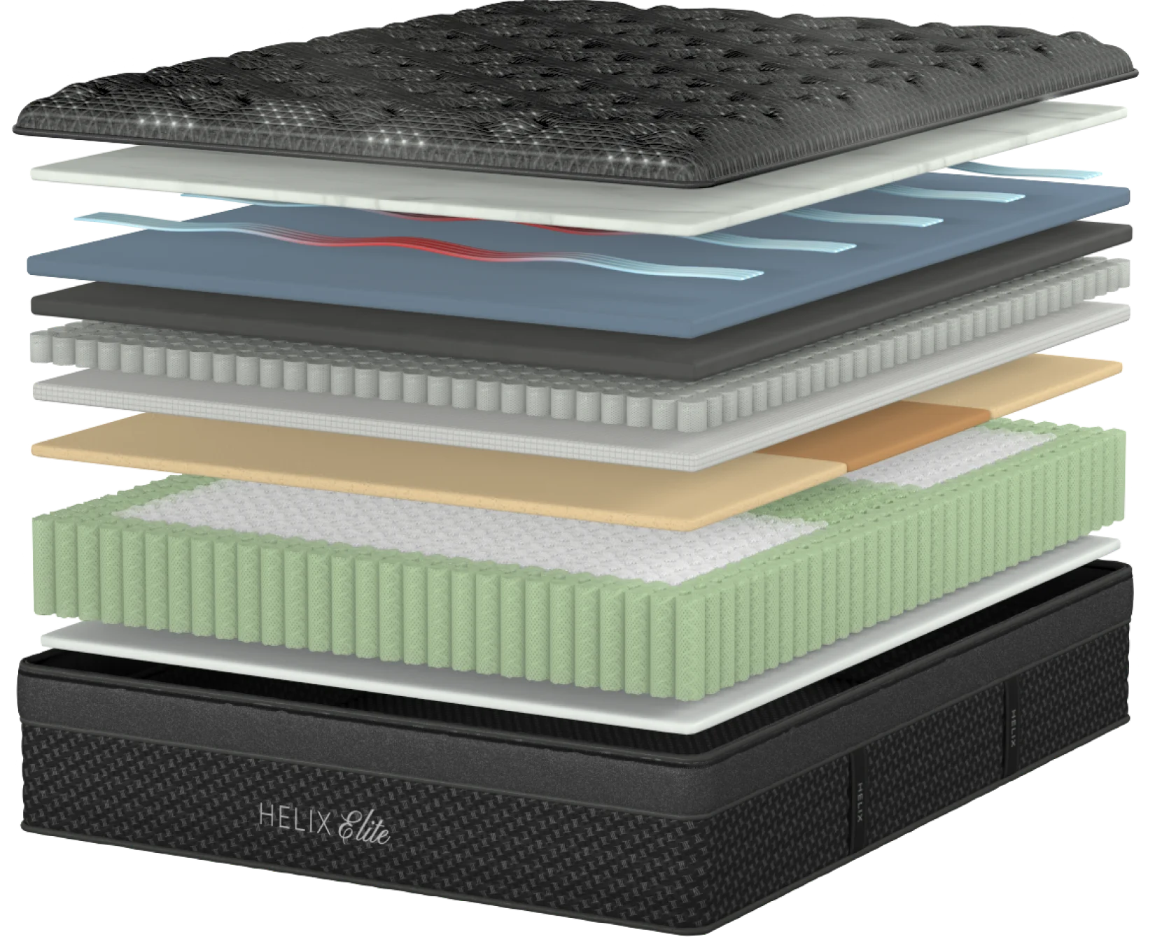 Helix Twilight is a firm, supportive hybrid mattress with targeted zoning, two layers of pocketed, individually wrapped coils that isolate motion and prevent a sinking-in feeling, and pressure relief from contouring foam layers. A GlacioTex Elite cooling cover made from phase-change fabric wicks away moisture while adjusting to your body temperature for year-round comfort.