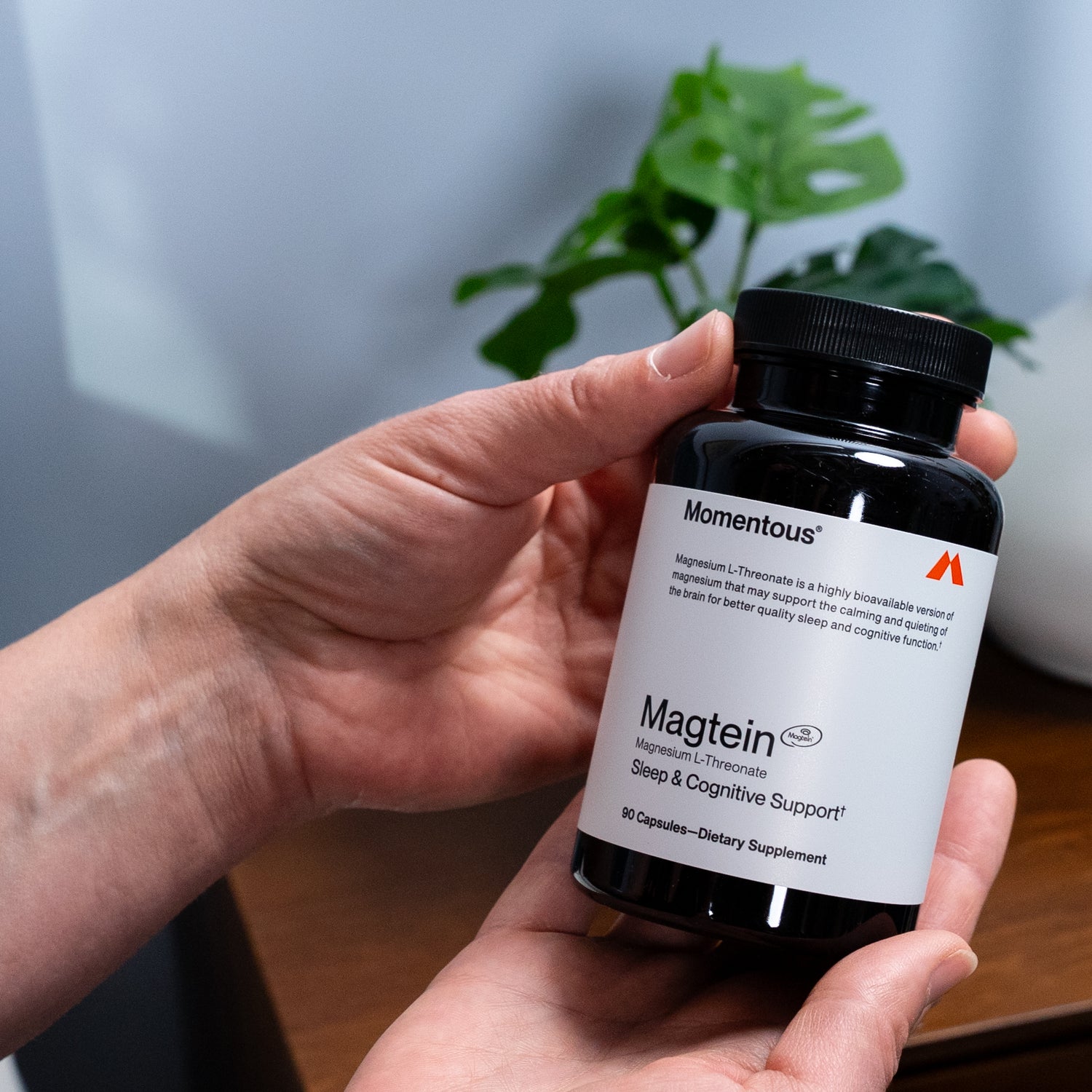 Momentous Magtein® is a patented form of magnesium L-yhreonate designed for superior absorption into the brain. L-threonate serves as a carrier, helping magnesium cross the blood-brain barrier for improved absorption.