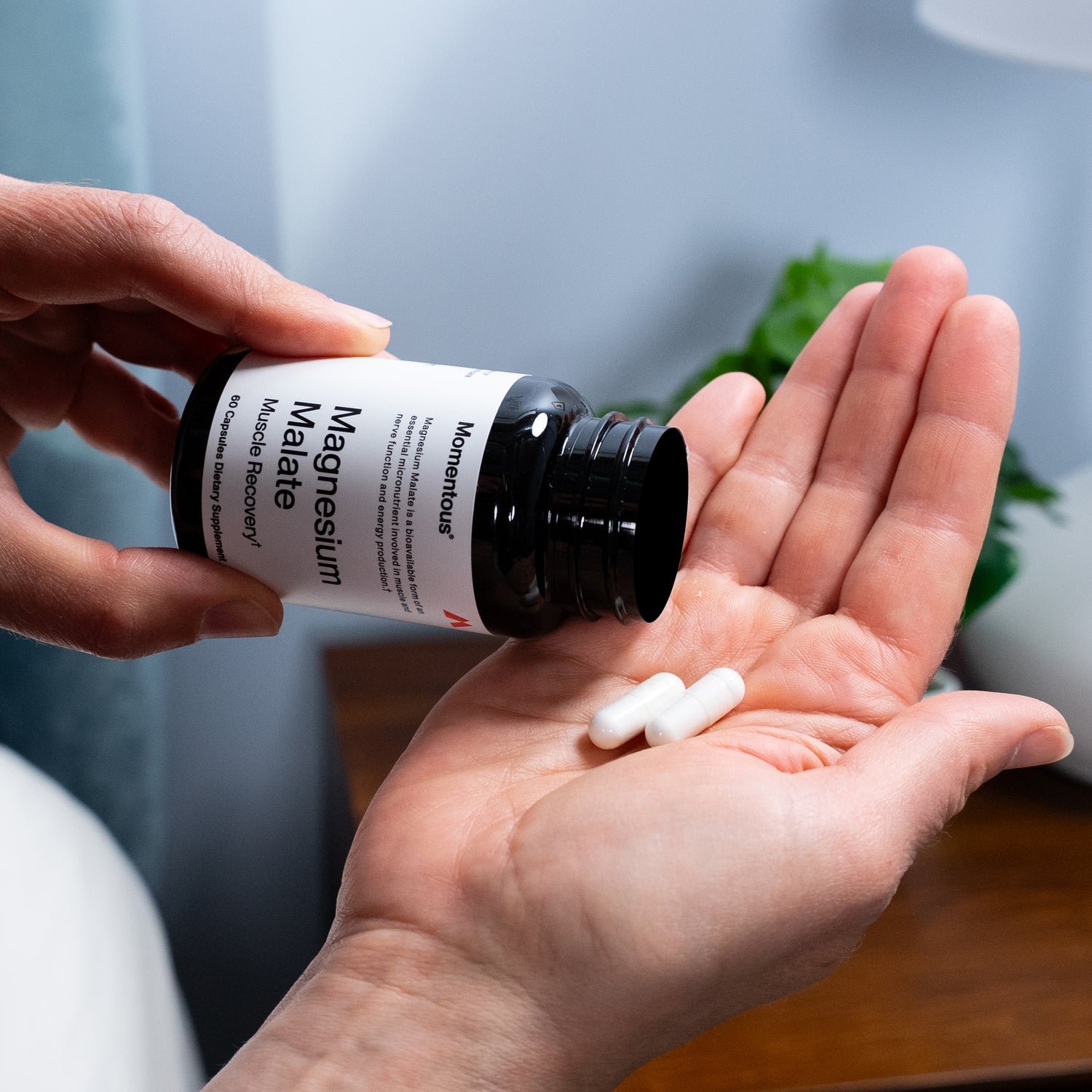 Momentous Magnesium Malate is a bioavailable form of magnesium that helps promote muscle recovery, ease tension, boost energy, improve nerve and muscle function, and support bone health. Each two-capsule serving provides 52% of the recommended daily value of magnesium, an essential element the body doesn’t make on its own.