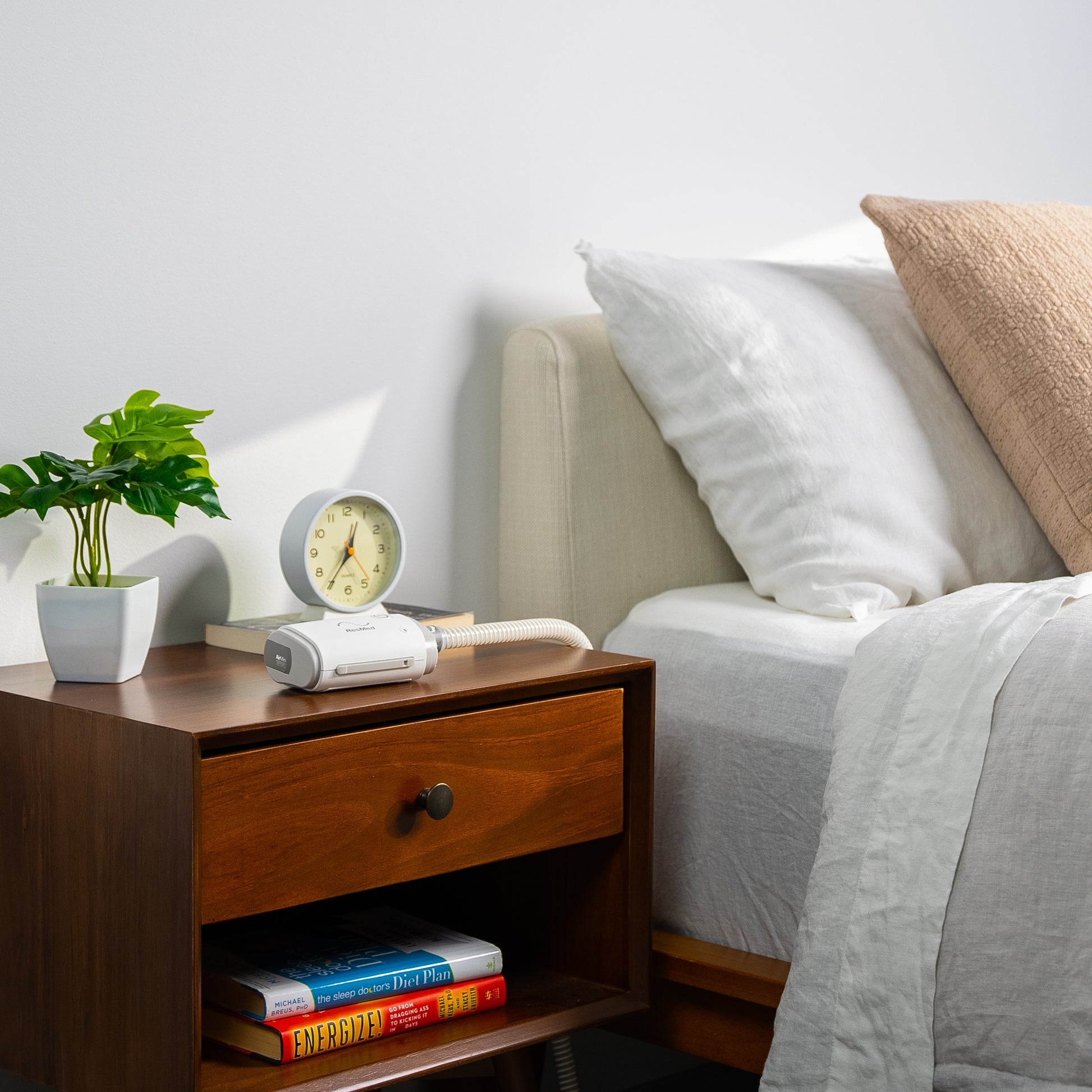 The ResMed AirMini™ has a compact size that makes it perfect for using on the go. The portable device offers waterless humidification, three different pressure settings, and an option to control the device via an app that also tracks key sleep metrics.
