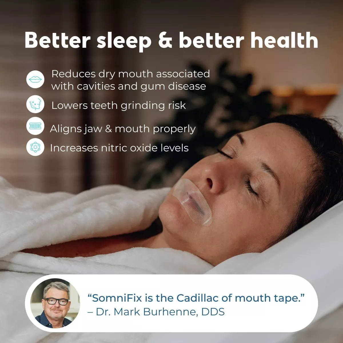 Designed as an easy-to-use alternative to chinstraps, SomniFix Mouth Strips offer a simple, gentle way to support healthier nighttime breathing by helping keep your mouth closed and encouraging nasal airflow. Each strip uses a soft, medical-grade adhesive and features a small breathing vent for added comfort. Developed by a physician and backed by a Harvard-validated clinical study, this U.S.-made product can help reduce snoring, dry mouth, and disrupted sleep.